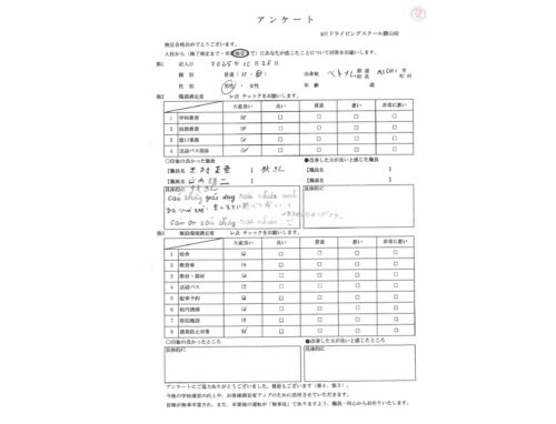 TOP アンケート紹介 愛知県 MT(ベトナム人) お客様の声 アンケート紹介 愛知県 MT(ベトナム人) 26歳 令和7年10月28日 お客様 年 齢 26歳 性 別 男性 住 所 愛知県 職員について 印象の良かった職員 。米村先生, 山内先生、タオさん. 印象の良かったところ 。男性先生は熱心で楽しい。 .Các thầy rất nhiệt tình và vui vẻ 。先生、皆さんは ありがとうございます。 .Cám ơn các thầy cô rất nhiều.