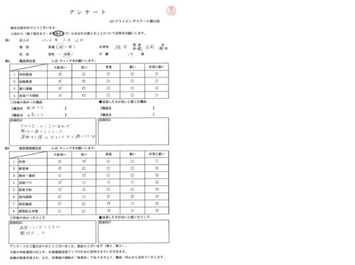 TOP アンケート紹介 福井県丸岡町 お客様の声 アンケート紹介 福井県丸岡町 19歳 令和8年3月26日 お客様 年 齢 19歳 性 別 女性 住 所 福井県丸岡町 職員について 印象の良かった職員 職員名 松井.古島 先生 分からないところがあれば、親切に教えてくださった。 運転する際のポイントなど教えてくださった。 印象の良かったところ 送迎してくださる方が親切だった。